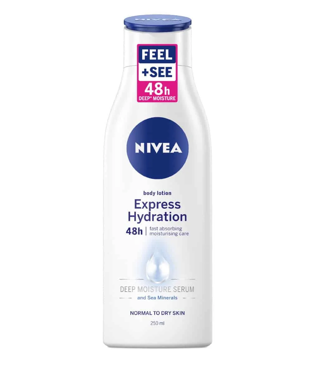 NIVEA Express Hydration Body Lotion provides your normal to dry skin with the moisture and care it needs and deserves. The formula with Sea Minerals supplies you with moisture – all day long.