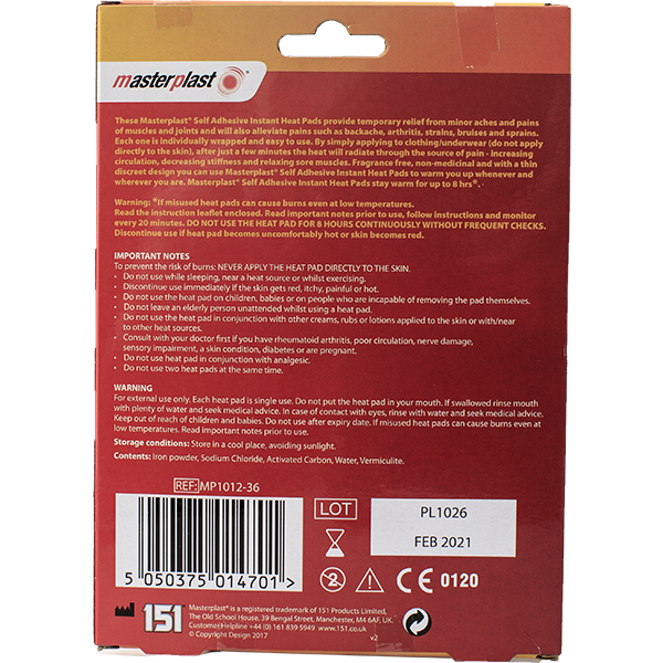 Simply apply to clothing / underwear (do not apply directly to the skin). After a few minutes the heat will radiate through the source of pain- – increasing circulation, decreasing stiffness and relaxing sore muscles.