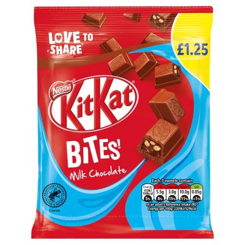 NESTLÉ KITKAT is a chocolate-coated wafer with a Choco layer. KITKAT Bites are delicious bite-sized pieces with a smooth chocolatey center and crispy wafer pieces. Open up the pouch, share with friends and reseal it to save some for later. This pack has 7 pieces of Ktikat 2fin