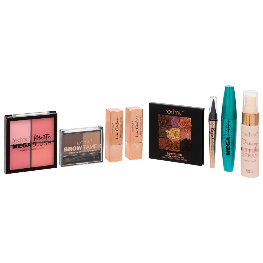 Contains: 1x Bewitched Pressed Pigment Palette (6.75g), 1x Dewy Setting Spray (31ml), 1x Mega Matte Blusher (11.2g), 1x Mega Lash Water Resistant Mascara (12ml), 1x Brow Tamer Eyebrow Kit (3.3g), 1x Kajal Eye Crayon (0.26g), 2x Lip Conture Lipstick (7g).