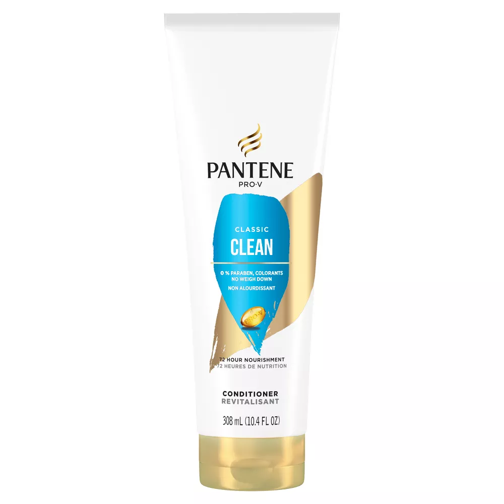 HARD WORKING, LONG LASTING Your haircare should work as hard as you do. Pantene PRO-V Classic Clean Conditioner nourishes to maintain manageability and keep hair looking healthy and shiny. This nourishing conditioner contains 2x more nutrients and won't weigh down your strands, so you get healthy looking hair with every wash with 72+ hours of nourishment. This formula is crafted with protective anti-oxidants and pH balancers to leave you with healthy-looking and nourished hair. With Pantene Pro-V Classic Clean, say goodbye to dirty hair and unleash nourished locks that look and feel beautiful for longer. 2X MORE NUTRIENTS, LASTS FOR 72+ HOURS Pantene PRO-V Classic Clean Conditioner is designed to be used with other products in our Classic Clean collection to infuse your strands with 2x more nutrients. This paraben free conditioner works together with Classic Clean Shampoo to permeate every strand for healthy-looking nourishment that lasts 72+ hours without washing. These formulas are crafted with protective antioxidants, Pro-Vitamin B5, and pH balancers, and made without parabens or colorants. TO USE Massage conditioner into your hair, making sure to pay special attention to your ends. Rinse thoroughly. These color-safe formulas are gentle enough for everyday use on chemically-treated hair or color-treated hair, and results last for 72+ hours without washing.